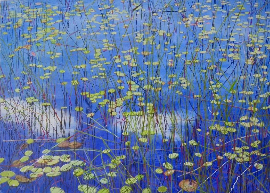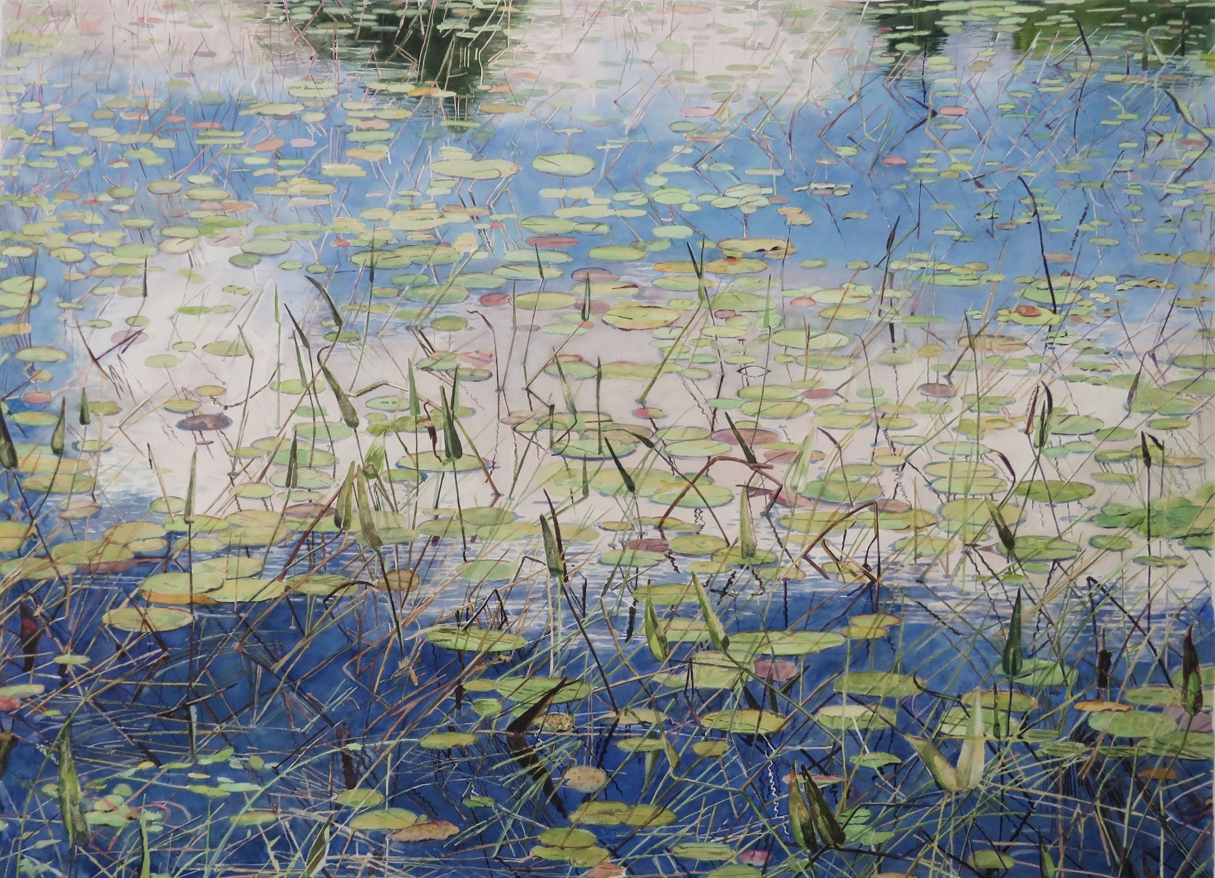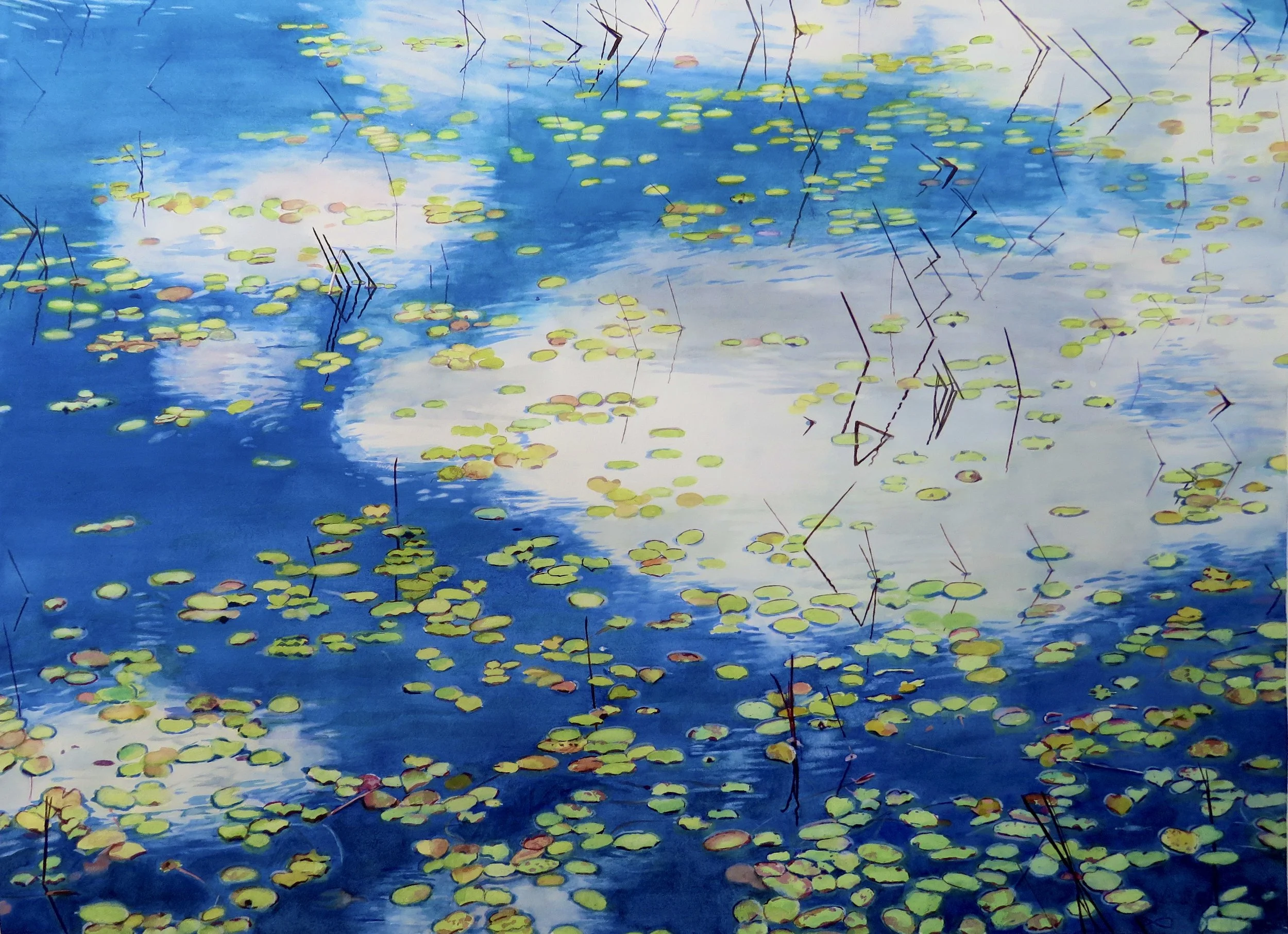 1. Lily Pads with Reeds and Clouds on Maine Pond, 21 x 29 inches, Watercolor / 2. Reflected Clouds on Acadia Pond, 35 x 48 inches, Watercolor / 3. Lily Pads and Clouds on Maine Pond, 21 x 29 inches, Watercolor
